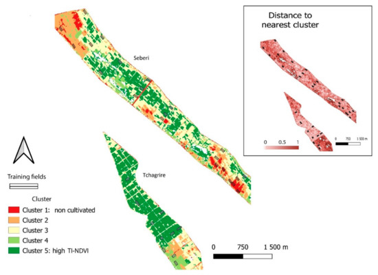 Using the eight grids with the TI-NDVI of each pixel for the eight seasons and the grid with the SI of each pixel, SCG enabled each pixel to be attached to one of the five clusters defined from the 64 study fields considered as training areas. Figure 9 shows the distribution of the five clusters over the entire study area, with the associated distance to the nearest cluster, which indicates when the cluster represents a given pixel well (i.e., small distance) or poorly (i.e., large distance). Clusters 1 and 2, both of which had low TI-NDVI during the dry seasons since they were often not cultivated, were located mainly in the north and south of the Sébéri system (Figure 9). Cluster 5, with the highest TI-NDVI in both dry and wet seasons, predominated in the north of the Tchagriré system and the center of the Sébéri system. Cluster 3, with moderate TI-NDVI in both seasons, represented large areas in Sébéri in intermediate positions between clusters 1 or 2 and 5, but also in non-agricultural areas (e.g., paths, natural areas), which had large distances to the nearest cluster. Cluster 4 occupied small areas in Sébéri and the south of Tchagriré, often near fields of cluster 2.