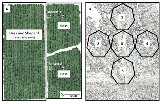 Schematic diagram showing (A) examples of two transects in an avocado orchard consisting of single-cultivar blocks of Hass and a mixed block consisting of alternating rows of Hass and Shepard; Hass was planted in 20 contiguous rows, and fruit were sampled from individual trees at rows 1, 2, 3 and 10 from the mixed block; and (B) the stratified sampling design for each avocado tree: two fruit were sampled from each of the five sectors, one from the inside and one from the outside of the canopy in each sector.