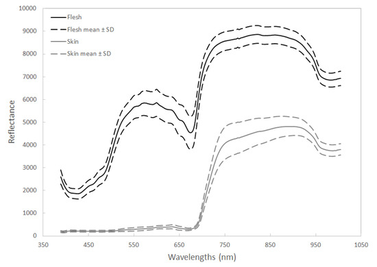 Reflectance from flesh samples was higher than from skin samples, and the spectral patterns of flesh and skin images differed greatly at wavelengths between 400 and 650 nm (Figure 2). Reflectance from flesh samples dropped at wavelengths around 675 nm (Figure 2).