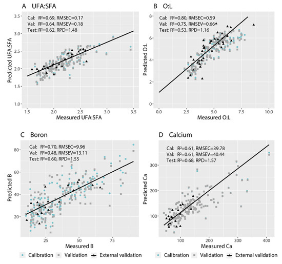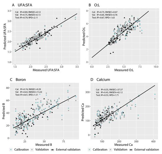 Measured vs. predicted values for the (A) ratio of unsaturated:saturated fatty acids (UFA:SFA), (B) ratio of oleic:linoleic acid (O:L), (C) boron concentration, and (D) calcium concentration of Hass avocado flesh using hyperspectral images of fruit skin.