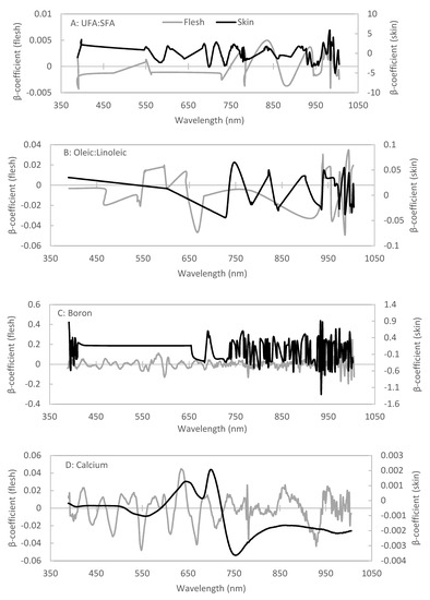 We identified specific wavelengths important for predicting fatty acid composition and mineral nutrient concentration. The wavelengths with the highest β-coefficients, thus contributing most to the predictive ability of the models, were between 970 and 1000 nm for UFA:SFA and O:L from either flesh or skin images. Reflectance in the 950–1000 nm region in other crops has been associated with prominent molecular bonds such as O–H and C–H in fatty acids [61,64]. High β-coefficients at 580, 590, 780 and 960 nm were important in predicting Ca concentrations from flesh images and high β-coefficients around 650, 700 and 760 nm were important in predicting Ca concentrations from skin images. Spectral patterns and wavelengths associated with alkaline earth metals such as Ca and Mg have been identified from canarium nuts, okra leaves, and soil samples, with high β-coefficients at 570–650, 770–790 and 860–1000 nm [8,65,66]. We found high β-coefficients at 690 and 930 nm when predicting B concentrations from either flesh or skin images. Similar spectral regions are also important in predicting B levels in whole-plant legume samples [60]. Inorganic materials such as Ca or B may not be spectrally active, but prediction is possible when inorganic materials bind with molecules, often organic complexes, that have covalent bonds such as N–H, S–H, O–H, C–H, C–O or C=C [7,58]. Therefore, B and Ca concentrations can still be predicted indirectly using hyperspectral imaging.