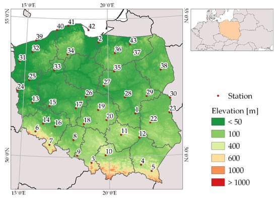 Study area with location of 43 meteorological stations used in this study. Background: Global Multi-resolution Terrain Elevation Data 2010 (provider: U.S. Geological Survey). IDs of the stations according to the register of the Polish public administration, Institute of Meteorology and Water Management—National Research Institute.