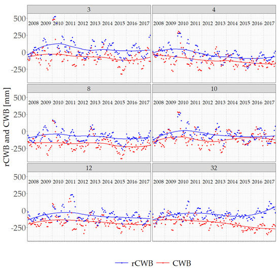 Time series of rCWB and CWB for six localizations and 10 years from 2008 to 2017 are presented in Figure 2 (results including the time series, trends in dependent on periods as well as correlations for all 43 analyzed localization can be found in Appendix B). The graphs include the results of smoothing as blue and red lines for a better visualization of long-time fluctuation. The smoothed lines visualize the tendency with lower CWB values from the long-time perspective. The evidence of drought—see localizations 3 and 8 for 2015—and extremely wet periods—see beginning of 2010 year for localizations 3, 4 and 10—are visualized. In some cases, good agreement of rCWB and CWB values was noted in extreme conditions as in 2010 when the wet conditions were observed for localizations 3, 4, 8 and 10 in Figure 2. On the other hand, the significant disagreement between rCWB and CWB, including the opposite trends, was observed, especially visible for all locations in 2011 for periods R7–R13. In extreme situations disagreement was higher than 500 mm, as in case of localization 12.