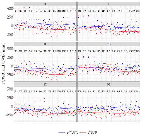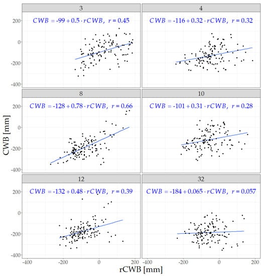 The correlation coefficients were determined as quantitative indicators of the compliance of the time series for each location. The correlation coefficients r for all evaluated localizations vary in the range from 0.06 (localization 32) to 0.68 (localization 8) and are presented in Appendix B. The correlation graphs for six localizations are presented in Figure 3. The particular graph presented in the figure was evaluated based on 130 data points (including 10 years and 13 reporting periods per year). The tendency with lower values of CWB comparing to rCWB was observed for all considered localizations.