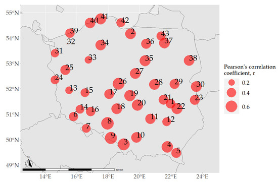 Considering the spatial distribution of r coefficients presented in Figure 4, higher correlations were observed for the locations in the belt from South–Central to North–Central Poland. The correlation coefficients for that sub-region were predominantly higher than 0.5 with the maximum value of 0.66 for localization 8. As one can see, in general, the lower correlations were observed in the western region of the country, where r ranged from 0.06 to 0.49. The lowest value was observed for the localization in the North–Western part of Poland—localization 32. On the country scale, the most common correlation coefficient was 0.5.
