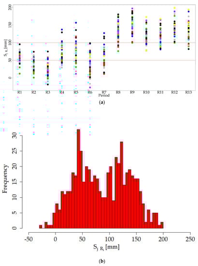 The indicator Sj,Ri significantly depends on the period of the year. Results presented in Figure 6 show that on average Sj,Ri values increase as we move towards the later periods with a clearly visible break point between R7 and R8 that falls at the end of May (close to 160 DoY). The highest Sj,Ri with values closest to 200 mm were observed for periods R9 and R12. In addition, for periods R4 and R5, most localizations are characterized by Sj,Ri higher than 50 mm, while for periods R8–R13, most Sj,Ri values lie above 100 mm. Results shown in the Figure 6 provide two main points: first, the change in mean values (the average: ) of the Sj,Ri for a particular period indicates time-dependent fluctuations associated with the vegetation cycle or climatic behavior for Poland; second, discrepancies in Sj,Ri values within a given period provide the information about fluctuation on spatial distribution of Sj,Ri. As we can see, both the significant sensitivity of Sj,Ri for time-dependent impact, as well as for spatial distribution, were observed. The histogram in Figure 6b shows two clearly observed maxima for values around 45 mm and 125 mm. The first value is the most probable for periods from R1 to R7; the second one for periods from R8 to R13. Concluding, for periods in the second half of the year, Sj,Ri indicators increased almost threefold. Considering the spatial distribution, it was shown that the spatial fluctuation of Sj,Ri was almost constant and the spread of the Sj,Ri values in relation to the average was close to ±50 mm, regardless of the period.