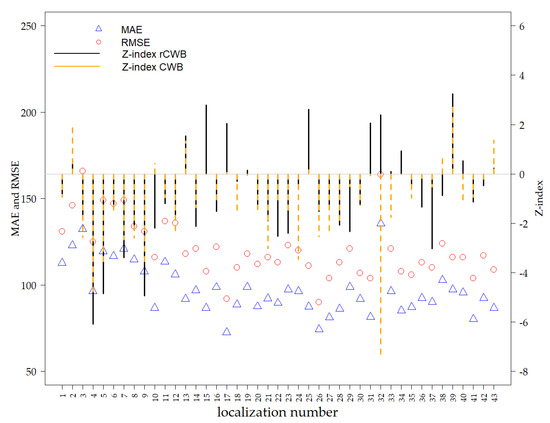 Considering the variance of the Z-index, it was observed that the simultaneous negative indicator value for rCWB and CWB was recorded for 28 stations, and only for six cases was it simultaneously positive. In nine cases, the sign of the Z-index was inconsistent for rCWB and for CWB. In addition, except for the localization, 32 were already indicated as having the higher RMSE and MAE. Figure 7 clearly shows a group of locations with significantly elevated RMSE and MAE values—10 localizations on the left side of the graph (1 to 12, excluding 4 and 10).