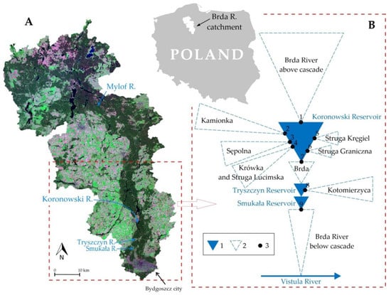The study area is located on the Brda River catchment, which is a left tributary of the Vistula River (Figure 1). Our detailed research was focused on Brda River’s tributaries and their catchments, inflow to the Koronowski, Tryszczyn, and Smukała reservoirs. The diagram of detailed catchments in the study area is presented in Figure 1.