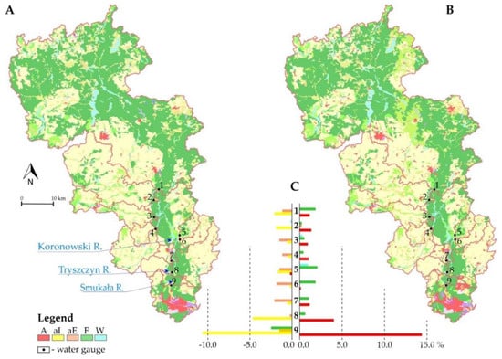 CLC land use of the Brda catchment area: (A) in 1990, (B) in 2018, (C) changes in subcatchments [%] between 1990 and 2018, no. 1 to 9 there are catchments showed on Figure 1.