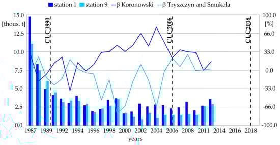 The second group of factors, described by Geist and Lambin [], underlying group, took place after 1990 when we were dealing with the migration of society to the outsides of the city. This results in the dispersion of environmental pressure (pollution sources in the catchment area) that may have a potential impact on water quality. On the other hand, the programs in the field of wastewater management carried out at an increasingly higher technological level guarantee the reduction of loads supplied from anthropogenic sources [].
