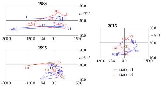 The analysis of the loop systems of the SSL transport balance in conjunction with the discharge indicates a large seasonal variation and the impact of the operation regime of reservoirs. The shift toward the value of the positive loop curves over time (1988–2013) indicates a decrease in the flushed material from the reservoirs (Figure 4). This confirms the above conclusions regarding the reduction of loads inflowed to and outflowed from the reservoirs. It should be noted that the majority of the load is delivered by the Brda River, in the case of the Koronowski Reservoir it is on average from 83.3% (1988) to 74.7% (2013), and for the Smukała Reservoir from 96.6% (1988) to 98.0% (2013). This is mainly due to the absolute size of the SSL transport medium, i.e., the volume of the Brda River flows compared to the other tributaries of the cascade reservoirs, conditioned by the areas and formations building the catchments. At the same time, the monthly values of outflowed sediments (β < 0) are getting lower and lower, respectively from the maximum level of −268% for the Koronowski Reservoir in 1988, to −60% in 2014 for the Smukała Reservoir (Figure 4).