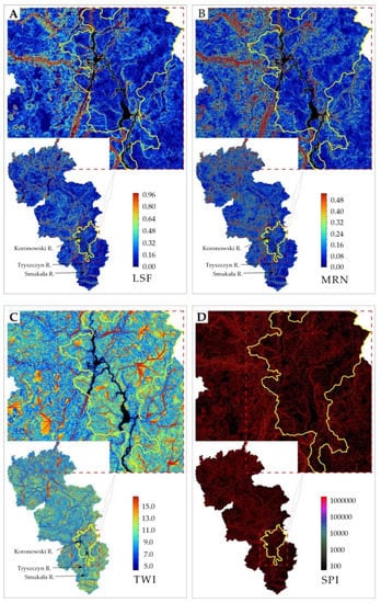 Spatial image of morphometric and physical characteristics of the Brda River catchment, (A) LS Factor (LSF), (B) Melton Ruggedness Number (MRN), (C) Topographic Wetness Index (TWI), (D) Stream Power Index (SPI).