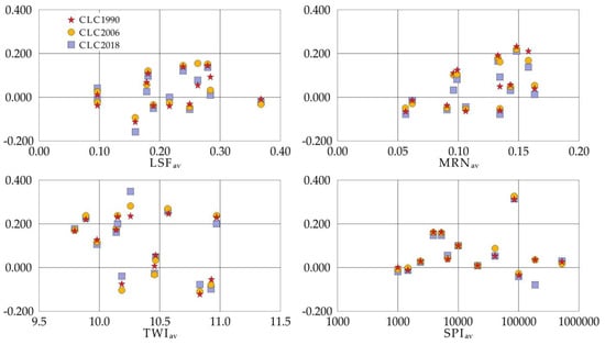 The correlation between the values of morphometric and physical indicators and the land cover based on the CLC for the years 1990, 2006, 2018 was determined for individual analyzed subcatchments in the longitudinal Brda River profile. Generally, there is no correlation between the CLC and the examined indicators. The values of the probability factor oscillated for the examined morphometric and physical indices in the range of: LSF from −0.156 to 0.155, MRN from −0.073 to 0.226, TWI from −0.118 to 0.354, and SPI from −0.077 to 0.336 (Figure 7). Based on the values shown in Figure 7 it can be assumed that the increase in the values of the LSF and MRN indexes, linking the vertical intensity of the terrain relief with the denudation process, is directly proportional to the probability of their association with the CLC classes. R2 values decrease in the analyzed period (1990–2018), which indicates that the CLC is less and less related to specific denudation index values. The values of the remaining two analyzed parameters (TWI and SPI) are inversely proportional to the probability with the individual CLC classes. R2 values increase in the analyzed period (1990–2018), indicating an increase in the relationship between CLC and indicators determining the dynamics of sediment movement in sections of river valleys. Thus, it can be assumed that the CLC changes taking place directly in the river valleys are more related to the denudation process than the changes taking place in other areas of the catchment area.