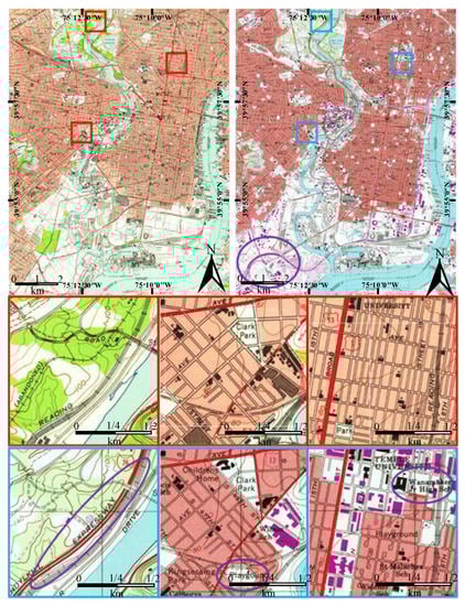Historical topographic maps play a vital role in the study of geographic information-related areas such as landscape ecology [], land-cover changes [,], and urbanization []. As a result of the importance of geographic information stored in topographic maps, many historical maps have been collected in archives and are available as scanned data sources []. Figure 1 illustrates two scanned topographic maps (STMs), which display the same region of Philadelphia in 1949 and 1995, from the United States Geological Survey (USGS)’s historical topographic map collection project []. Some changes can be found between these two STMs and there would be little difficulty detecting all changes if we had all the geographic information in these maps. Unfortunately, the geographic features in scanned raster images cannot be directly recognized or edited in a Geographic Information System (GIS) or other analytical software program. Image processing and pattern recognition procedures must be performed in sequence to transfer the raster format data into vectorization data []. The most crucial is segmentation, the outcome of which directly influences the subsequent geographic information extraction steps []. Figure 2 illustrates the goal of segmentation of STMs. Each pixel in the segmentation should be given a unique label that represents its category.