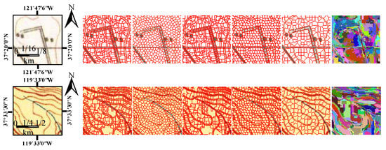 The occurrence of less over-segmentation can also be quantitatively evaluated from Table 2, which shows that AGWT generates far fewer superpixels than GSM-TM. Although with only one-eighth to one-half of the superpixels compared to GSM-TM, the edges between different geographic elements, especially between area elements (for example, the vegetation area and the background), are well retained in AGWT, as shown in the third to fifth columns of Figure 8. The quantitative assessment in Table 1 further demonstrates the strong boundary adherent ability of AGWT. Compared to GSM-TM, AGWT has a significant increase in BP (around 0.4), with only a small reduction in BR (around 0.02), which also should contribute to the reduced over-segmentation. More importantly, with fewer superpixels, AGWT still achieves an average of 0.06 on UE, which is superior to GSM-TM. Compared with the CNN-based method, AGWT has better performance in all three metrics. This further proves that AGWT is a more qualified approach for STM than those popular methods, even DL-based approaches with high computational cost, applied for natural images. In summary, AGWT has strong boundary adherent ability (from Table 1) and less over-segmentation (from Table 2), making it suitable for superpixel generation on STM.