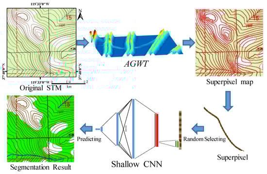 In recent years, STM segmentation methods based on region information have been proposed [,], in which pixels are no longer the processing object. In one method [], linear elements are extracted at the beginning and the classifying operations are applied to independent linear elements, as segmentation is equivalent to classifying these linear elements. Area elements such as vegetation or the lack thereof are not considered. In another method [], over-segmented superpixels are generated for each given STM; then, a support vector machine (SVM) is trained based on handcrafted color and texture features extracted from manually labeled superpixels and employed to classify the remaining ones. These two methods can overcome false color and color aliasing problems by applying region-based principles. The features which they use are still artificially designed and are not suitable for all types of STMs. In addition, the over-segmentation problem of superpixels generated using the second method [] leads to instability of the connectedness in segmentation results.