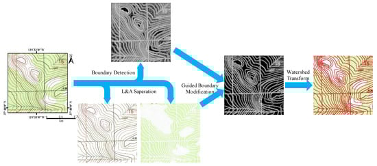 Similar to GSM-TM, the linear element is still a key clue to remove weak boundaries, but the difference is that we also apply the area elements as a clue in AGWT. The main procedures can be seen in Figure 5, including boundary detection, linear and area element (L&A) separation, guided boundary modification, and the final watershed transform.