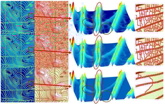where represents any pixel in and the distance is the number of pixels in the nearest path between and cross point . After modification, all those false boundary walls in will be broken with small holes, which means that there will not be any edges on those false boundaries after subsequent watershed transform (as indicated by the red circles on the 3D models in Figure 6). It should be noted that this modification strategy has a similar fundamental idea as in GSM-TM, which is to reduce the strengths of false boundaries based on their distance from the cross points, only it is simpler and more practical. This is why the modified boundaries in linear element regions seem the same for GST-TM and AGWT in Figure 6.