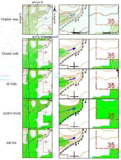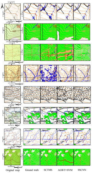 Sample patches cut from map dataset and corresponding ground truth and segmentation results. From left to right: original map, manually labeled ground truth, segmented results of SCTMS, AGWT+SVM, and SSCNN, respectively.