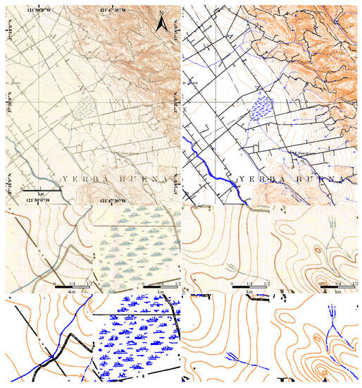 - Liu, T.; Miao, Q.; Xu, P.; Song, J.; Quan, Y. Color topographical map segmentation algorithm based on linear element features. Multimed. Tools Appl. 2016, 75, 5417–5438. [Google Scholar] [CrossRef]