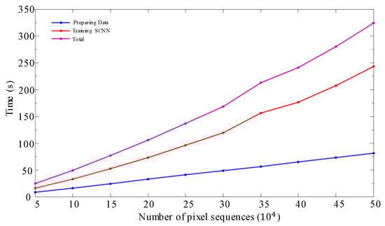 To further demonstrate the efficiency of SSCNN, a sequence of experiments was conducted on various sizes of training datasets and STMs. We trained the SCNN using different numbers of pixel sequences, from 5 × 103 to 5 × 104. The running times for generating data and training the SCNN and the total time are shown in Figure 12.