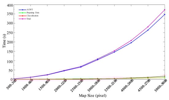 In addition to accuracy, the efficiency of the training and testing procedures of the SSCNN is demonstrated in Figure 12 and Figure 13, respectively. Figure 12 shows the curves of time cost along with the increased size of training datasets. The time costs of preparing the dataset and training the SCNN are almost linear to the length of the pixel sequence. Only less than 6 min is required for the training step with 5 × 104 pixel sequences, which means less than 0.001 s per pixel sequence for training. Figure 13 demonstrates the segmenting speed, where the time cost for data preparation and classification is almost linear along with the STM size. Moreover, the increased time spent by AGWT approaches times the STM size, where N is the STM size. We can see from Figure 13 that the size difference between the smallest and largest STM is 100 times, and the time increased by approximately 150 times. Considering the STM size and time required for manual labeling [], SSCNN can be regarded as an extremely efficient algorithm. This approach can be directly applied to full-size STMs to achieve reliable segmentation quality in a very short time. We believe that it can make a large contribution to the field of information extraction from STMs.