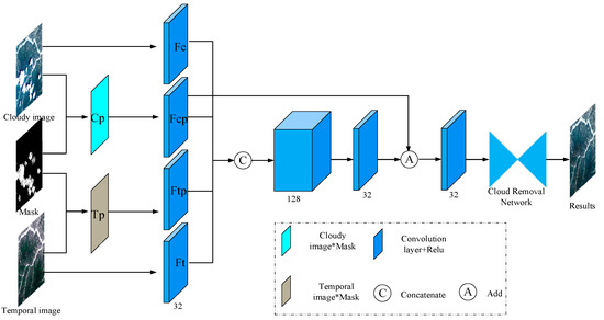 The overall framework. Cp and Tp are results of the bi-temporal images being multiplied by the cloud mask map pixel-by-pixel to filter out the cloudy area. Fc, Fcp, Ftp, and Ft are features extracted from cloudy image, Cp, Tp, and temporal image with 32 3 × 3 convolution kernels, respectively.