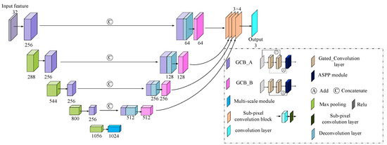 The structure of the network. The traditional convolution layers are replaced by the gated convolution layers with two types GCB_A (purple) and GCB_B (pink). A multi-scale module (sky blue) is applied at the top of the encoder, and a multi-scale fusion is introduced to concatenate the last features of different scales of decoder, which are upsampled with sub-pixel convolution blocks (orange) respectively.