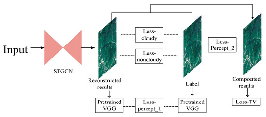 The framework of the proposed STGCN was shown in Figure 1. The current cloudy image, a mask map of clouds and cloud shadows, and a cloudless recent image of the same area were prepared in advance as the input. The mask map, which was a binary map where 1 represented the clean pixels (black), and 0 represents the clouds and cloud shadows (white), can be generated from recent CNN-based detection methods [43,44,45] or manual work. When an automatic algorithm was applied, the recall rate should be set high to detect most of the clouds; however, a relatively lower precision score will not affect the performance of the cloud removal task as a large number of clean pixels remain to train the cloud removal network. The cloudless temporal image can be selected under two conditions: (1) The two images can be accurately geo-registered, and (2) the time span of the two images was not too long for ensuring that no large land cover changes could have happened.