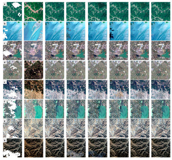 The performances of different methods for removing real clouds were judged by the visual effects, as shown in Figure 6, for example. First, the clouds and cloud shadows were detected by a cloud detection method called CDN [41]. Then, the mask of the cloud and cloud shadow was then expanded by two pixels to cover the entire cloud area to avoid the damaged pixels involved in training the network. Finally, the CNN-based methods were trained with the remaining clean pixels.
