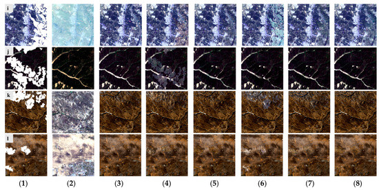 Comparison of cloud removal results predicted from different methods in different scenes of WHU cloud dataset. (1) Simulated cloudy image. (2) Temporal image. (3) Label. (4) Pconv. (5) spatial-temporal-spectral based cloud removal algorithm via CNN (STSCNN). (6) non-local low-rank tensor completion method (NL-LRTC) (7) cloud removal network (CRN). (8) spatial-temporal based gated convolutional network (STGCN). (a) and (b) are samples from data I, (c,d) from data II, (e,f) from data III, (g,h) from data IV, (i,j) from data V, and (k,l) from data VI.