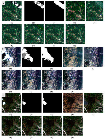 Comparison of cloud removal results predicted from different methods. (1) Real cloudy image. (2) Clouds and cloud shadows mask detected from CDN with high recall. Cloud shadows are marked by gray, and clouds are marked by white. (3) Mask after expansion operation. All invalid pixels are marked by white. (4) Temporal image. (5) Pconv. (6) STSCNN. (7) NL-LRTC. (8) CRN. (9) STGCN. (a–c) are repaired samples of real cloud images from different scenes.