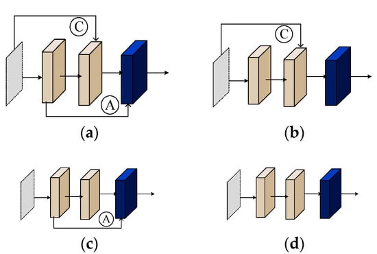 GCB_A block and GCB_B block with and without the addition layer. (a) GCB_A with addition layer; (b) GCB_A without addition layer; (c) GCB_B with addition layer; (d) GCB_B without addition layer.