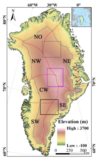 During the DEM evaluation process, the time interval of the selected IceBridge data was consistent with that of the data used to generate the DEM. Then, the area was divided according to elevation and watershed, and the regional error of the DEM was analyzed. According to the current international basin division method, the Greenland region is divided into seven basins, as shown in Figure 1: North (NO), Northwest (NW), Northeast (NE), Midwest (CW), Southwest (SW), and Southeast (SE) [29]. Finally, the special geographic location of Greenland makes it difficult to obtain GPS data, and the dramatic elevation changes have a great impact on the accuracy of the DEM. Considering the elevation changes in Greenland in different years, IceBridge data from different years were used to evaluate the accuracy of the DEM and analyze the stability of DEM products during the data acquisition time.