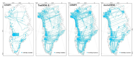 Analysis of sampling points among Greenland Ice Map Project (GIMP)1, TanDEM-X, GIMP2, and ArcticDEM.