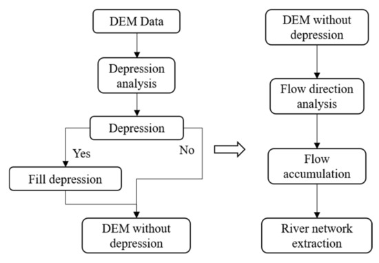 In this study, algorithm functions of hydrological elements provided by the integrated hydrological analysis toolbox in ArcGIS 10.5 were used for the extraction of the river network. In a DEM, a depression refers to a grid unit whose elevation is lower than those of other surrounding grid units. It is necessary to fill small and sporadic depressions to prevent them from affecting the extraction of the river network [30]. The flow direction map is generated according to the maximum slope between the DEM pixel and its eight adjacent pixels. The confluence accumulation of each grid is calculated based on the flow direction map. The grid pixels are extracted by setting an accumulation threshold; finally, the river network is generated. The extraction threshold is applied to extract the cells of the confluence accumulation above a certain value, which are used to generate the final river network. The technical process of river network extraction is shown in Figure 3. As a result that the river network in Greenland is completely frozen or even covered with snow in winter, which is similar to the surrounding environment, the river network disappears seasonally. In summer, the river network distribution on the images is obvious and quite different from the surrounding environment, and the information of the river network can be obtained clearly. Therefore, images from summer were selected to assess the river network extraction results.