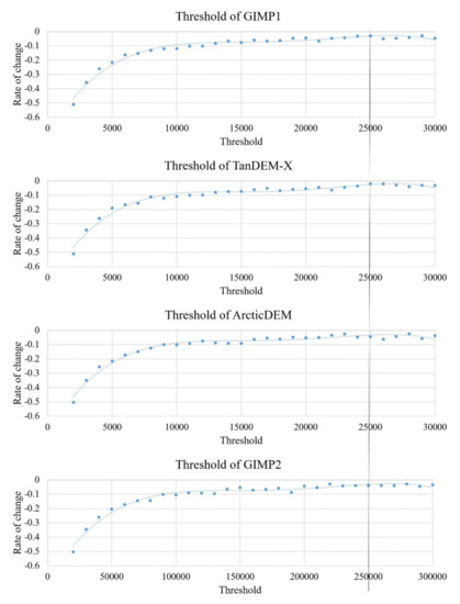 In this study, the fitting relationship between the extraction threshold and the change rate of the number of river networks was used to determine the river network extraction threshold. Figure 4 shows the change rate of the number of river networks extracted by the four DEMs according to different thresholds. The rate of change on the y-axis refers to the rate of decrease in the number of river networks for every increase of 1000 in the threshold. Figure 4 shows that as the extraction threshold increases, the number of river networks decreases, and the rate of change tends to become flat. The selection criteria of the extraction threshold in this study are as follows: as the threshold increases, the rate of decrease in the number of river networks reaches a low level and tends to flatten. At this time, the threshold is the theoretical extraction threshold of the river network. It can be seen from Figure 4 that when the threshold is 25,000, the number of extraction results from GIMP1, TanDEM-X, and ArcticDEM have the smallest rates of change. When the threshold continues to increase, the rate of change tends to remain the same, so the three DEMs are extracted using a threshold of 25,000. While the resolution of GIMP2 is higher (refer to Table 1), the accumulated volume is much larger than those of other DEM products, so the extraction threshold for GIMP2 is 250,000, as shown in Figure 4. The Greenland river network was extracted based on these thresholds in this study.
