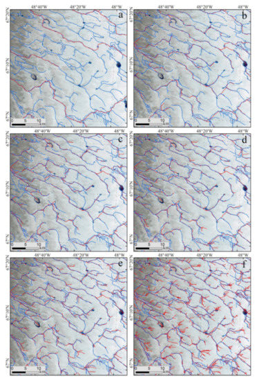 (a) River extraction results with a threshold of 25,000, (b) river extraction results with a threshold of 2000, (c) river extraction results with a threshold of 1000, (d) river extraction results with a threshold of 500, (e) river extraction results with a threshold of 300, (f) river extraction results with a threshold of 100. The background image is from Landsat-8, and the acquisition time of the image is August 6, 2014. The blue lines represent the river network digitized based on the Landsat image. The red lines indicate the river network extracted from TanDEM-X.