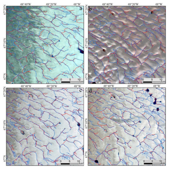 Comparison of remote sensing images and river network results in different years. The background images in (a–d) are from Landsat-8, and the acquisition dates are July 16, 2012; August 19, 2013; August 6, 2014; and July 10, 2016, respectively. The blue line is the river network digitized based on the Landsat images. The red lines in (a–c) are the river networks extracted from TanDEM-X. The red line in (d) is from ArcticDEM.