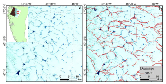 Verification of the GIMP1 river network extraction result. The basin name of the inset map is the Southwest basin. Panel (a) is the distribution of the actual river network, and panel (b) is the river network extraction result from the GIMP1 product. The background image is from Landsat-7 and was acquired on July 20, 2005.