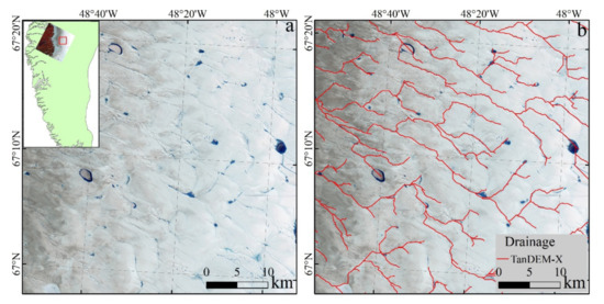 - Yang, K.; Smith, L.C.; Chu, V.W.; Gleason, C.J.; Li, M. A Caution on the Use of Surface Digital Elevation Models to Simulate Supraglacial Hydrology of the Greenland Ice Sheet. IEEE J. Sel. Top. Appl. Earth Obs. Remote Sens. 2015, 8, 5212–5224. [Google Scholar] [CrossRef]