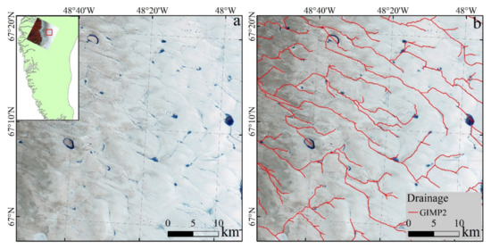 - Yang, K.; Smith, L.C. Supraglacial Streams on the Greenland Ice Sheet Delineated from Combined Spectral–Shape Information in High-Resolution Satellite Imagery. IEEE Geosci. Remote Sens. Lett. 2013, 10, 801–805. [Google Scholar] [CrossRef]