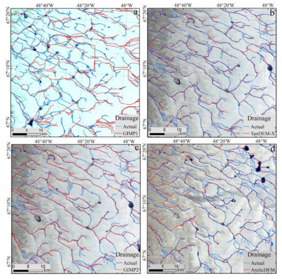 (a) The river network extraction results for GIMP1 are compared with the actual digitized river network. The background image is from Landsat-7 and was acquired on July 20, 2005. (b) The river network extraction results for TanDEM-X compared with the actual digitized river network. (c) The river network extraction results for GIMP2 compared with the actual digitized river network. The background image for (b,c) are from Landsat-8 and was acquired on August 06, 2014. (d) The river network extraction results of ArcticDEM are compared with the actual river network digitized. The background image is from Landsat-8, and acquired on July 10, 2016.