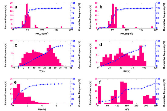 Distribution of particulate matter (PM)2.5, PM10 concentration(a,b), and probability density of meteorological parameters(c–f) at the Taocha monitoring station.