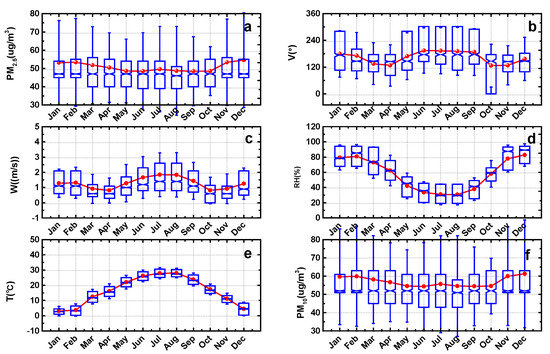 Box plot of monthly changes of PM2.5 and PM10 mass concentrations and meteorological parameters at TC monitoring station: (a) PM2.5; (b) wind direction; (c) wind speed; (d) relative humidity; (e) temperature; (f) PM10. The synapses stand for standard deviations. The red dots stand for mean values.