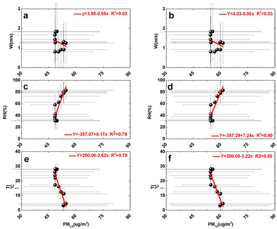 Correlation plot of PM2.5 and PM10 and meteorological parameters at Taocha monitoring station: (a) PM2.5 and W; (b) PM10 and W; (c) PM2.5 and RH; (d) PM10 and RH; (e) PM2.5 and T; (f) PM10 and T. The scatter points represent the monthly mean values of every parameter. The red solid lines represent the fitted lines. The synapses stand for standard deviations.