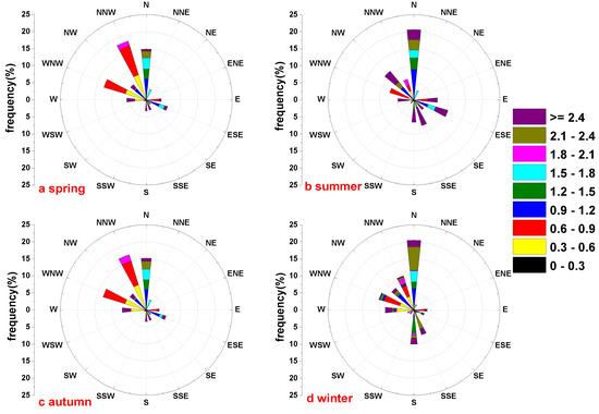 Four seasons’ wind speed and wind direction rosettes at the Taocha monitoring station.