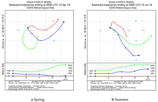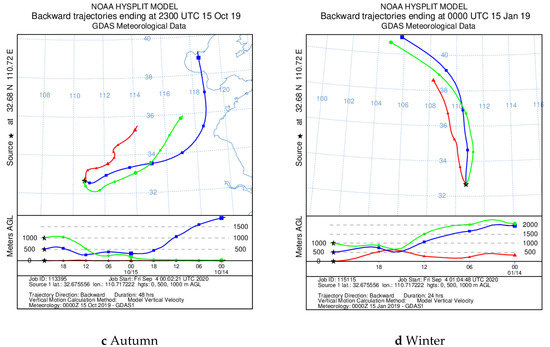 Figure 6 shows the relationship between PM2.5 and PM10 which can be helpful to reveal the source of particulate pollutants [42] at the TC station. The main sources of PM2.5 are soil particles, sea salt, plant pollen, volcanic ash, industrial smoke (heating, cooking, coal, gas, fuel oil), and exhaust gas from vehicle emissions [13]. PM10 not only includes PM2.5 but also particulates with slightly larger particle sizes, such as sand and dust [44]. The sources of PM10 and PM2.5 are generally different, such as sand and dust particles originating from natural sources, whereas fine particles (PM2.5) generally originate from anthropogenic emissions sources. In the study of Bilal et al., the source of particulates was mainly from the Pearl River Delta (PRD) through long-distance transportation in autumn and winter Hong Kong [45]. Therefore, the study of the relationship between PM2.5 and PM10 can qualitatively reveal the source of particles at the TC station. From Figure 6a–d, it is known that PM2.5 and PM10 maintain very strong positive linear correlations, with correlation coefficients of R2 = 0.99 in all four seasons. This phenomenon shows that the same variations of PM2.5 and PM10 existed at TC. At the same time, the slope of the fitted curve in Figure 6 shows that PM2.5 accounts for about 88% of the PM10 in all four seasons, a large proportion of the entire PM10, and the particles are mainly fine particles at TC. In Figure 7, the PM2.5/PM10 ratio showed high values, especially in summer compared to other seasons, which suggests that that PM2.5 could come from the anthropogenic activities [46]. To investigate the anthropogenic sources of PM in the TC site, the Hybrid Single-Particle Lagrangian Integrated Trajectory (HYSPLIT) model was utilized. We have selected a week time air mass trajectory in one season (Figure 8). It could be seen that on the ground surface, the air mass mainly came from the North, which was corresponding to the wind direction results above. Meanwhile, air masses of 500 m and 1000 m mainly came from Northeast provinces in the summer and Southeast provinces in autumn. In our previous research, the summer and autumn were grain harvest seasons; straw burning activities occurred frequently in Central China [47]. So straw burning activities could generate PM particles and these PM particles could also be blown to the TC site to formate a part of external pollution sources. This phenomenon might affect the air quality of the TC site. At the same time, from the analysis above, it can be seen that the mass concentrations of PM particles are low at the TC site, and the mass concentrations of PM2.5 and PM10 are all in line with the national secondary standard. The good atmospheric environment makes a certain contribution to the whole ecological environment required for water source regions. In the study of Chengdu, the average PM2.5/PM10 was 85%, which was the same as our study. It indicated that the proportions of PM2.5 contained within PM10 were quite high, further proving that fine particles were the greatest contributor to PM air pollution in Chengdu. Moreover, dust and sandstorms could cause the average PM2.5/PM10 to be lower (72%) in spring in the Chengdu site [43].