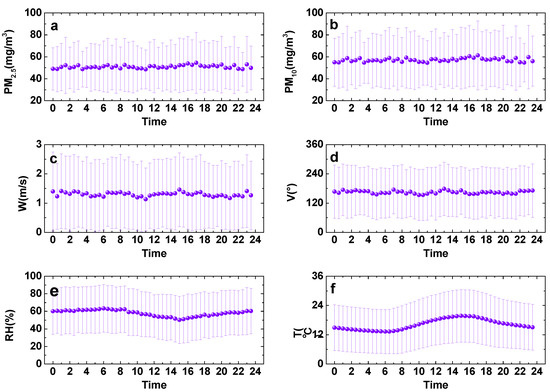 Daily variation characteristics of PM2.5 and PM10 and meteorological parameters at the Taocha monitoring station of the South–North Diversion Central Line Project: (a) PM2.5 mass concentration; (b) PM2.5 mass concentration; (c) W; (d) V; (e) RH; (f) T. The scatter points represent the number of days. The synapses stand for standard deviations.