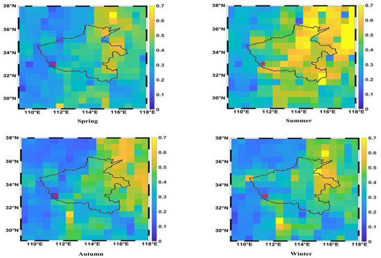 Seasonal variation characteristics of aerosol optical depth at the Taocha monitoring station of the South–North Diversion Central Line Project: spring; summer; autumn; winter. The red five-pointed stars stand for the location of the TC site.